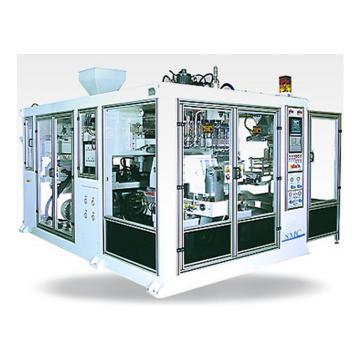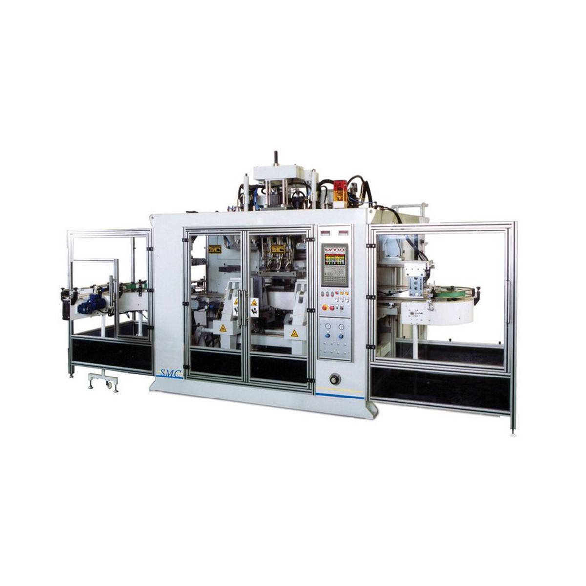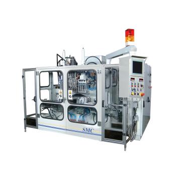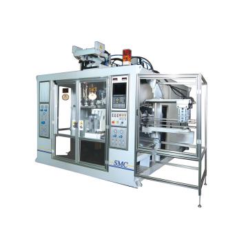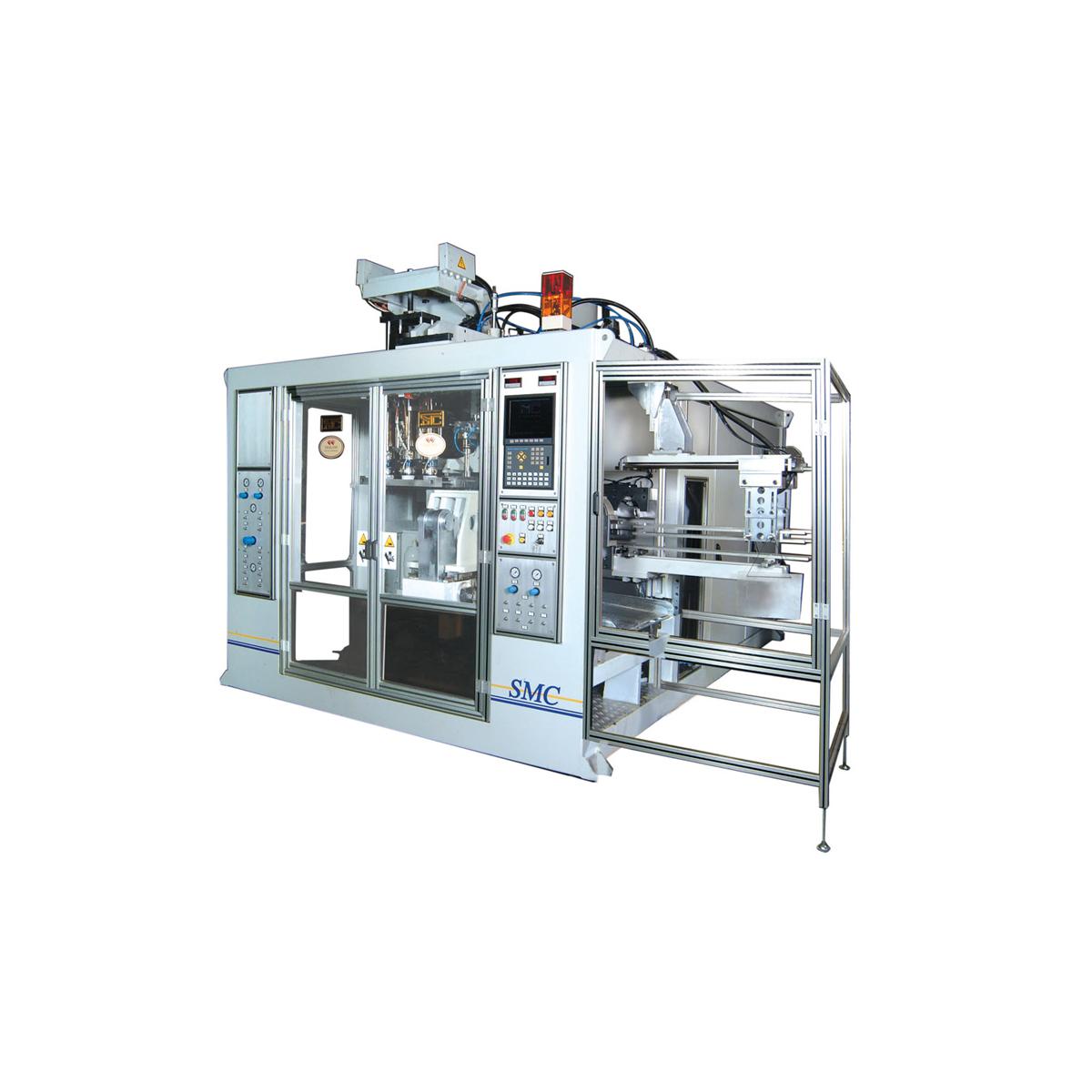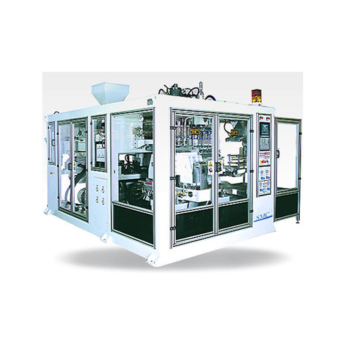 Linear clamping system on guide rails, using full proportional valve movement control. SMC’s high-end machine for fast and high-volume production of medium size containers ranging from 1-liter to 10-liter containers. Machine Features: